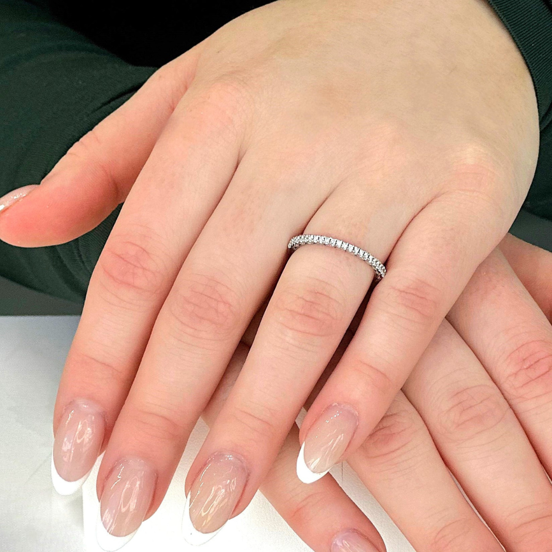 A beautiful string of diamonds on a 1.5mm band with a Petite Crescent inner face.