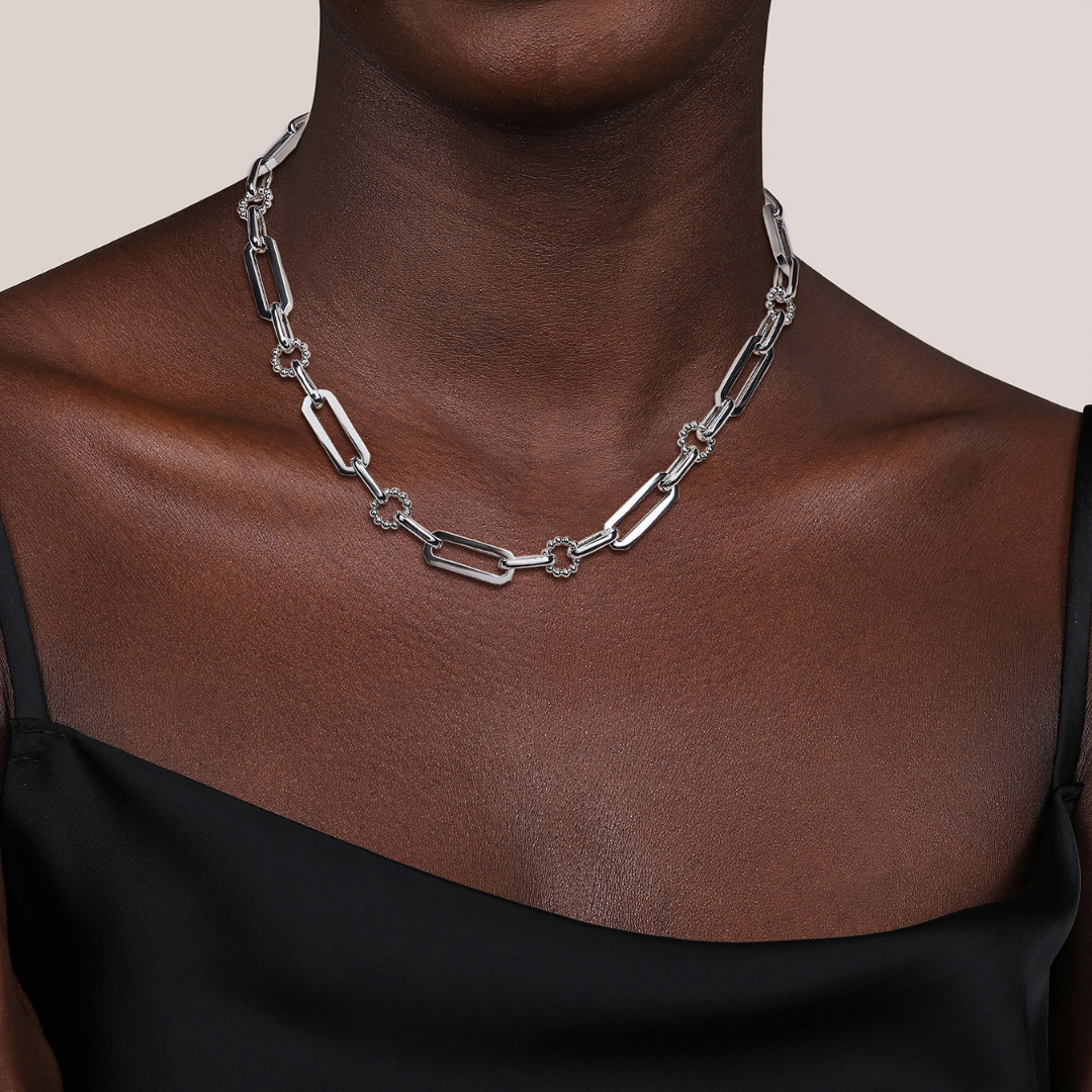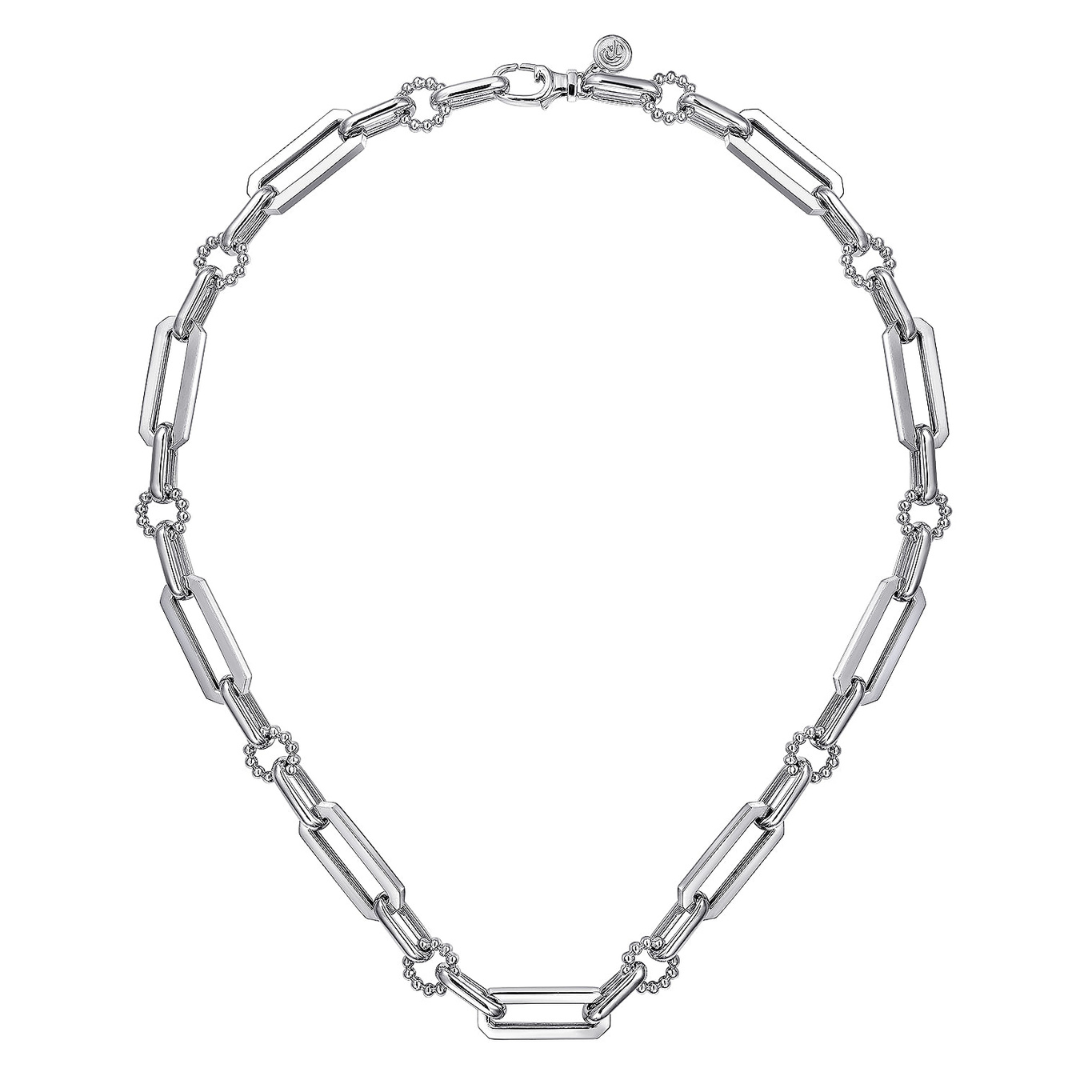 Make a bold statement with this modern rectangular link necklace, featuring sleek elongated links accented by delicate floral-inspired beaded connectors in a polished silver-tone finish. Perfect for layering or wearing solo, it adds edge and elegance to any outfit.