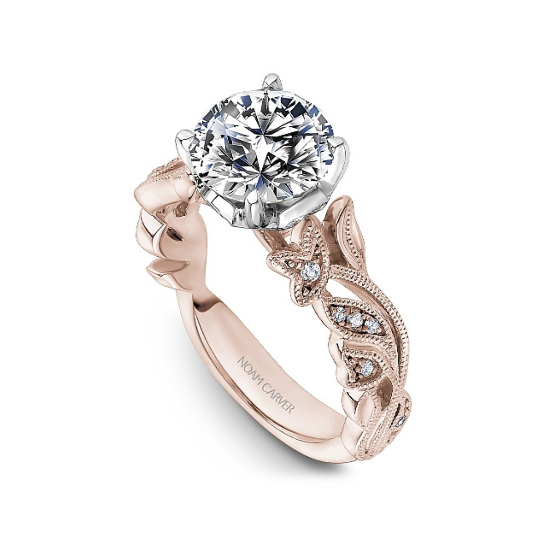 This two tone round diamond ring combines the elegance of white and rose gold with a dazzling round center stone, accompanied by a stunning floral design down the shoulders. A stunning blend of contrast and brilliance, it's perfect for modern style with timeless appeal.