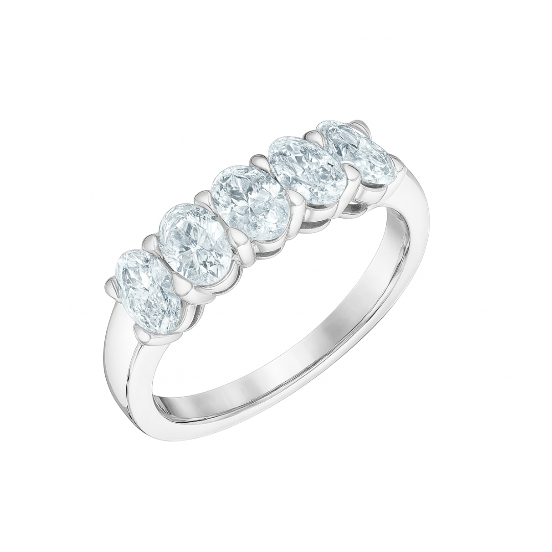This dazzling white gold diamond band ring features five oval shaped lab grown diamonds in a timeless shared-prong setting, offering exceptional brilliance and elegance. Perfect as a diamond anniversary ring, wedding band, or luxury gift, it adds radiant sparkle to any fine jewelry collection.