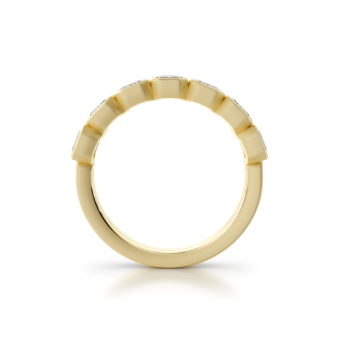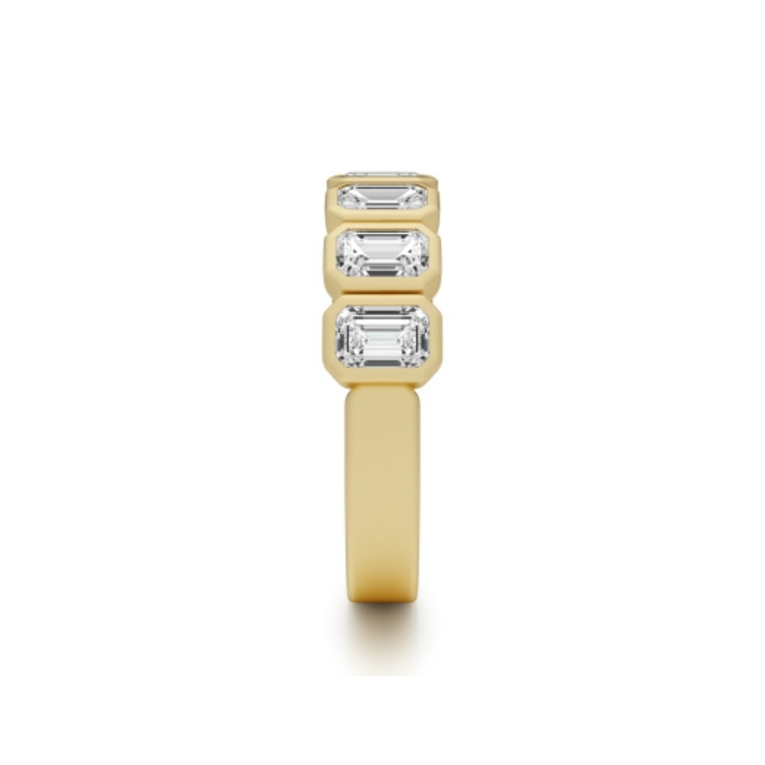 This yellow gold lab grown diamond band showcases ethically sourced Emerald Shaped Lab Grown diamonds in a sleek, satin finish. A perfect choice for a wedding band or stacking ring with sustainable brilliance.