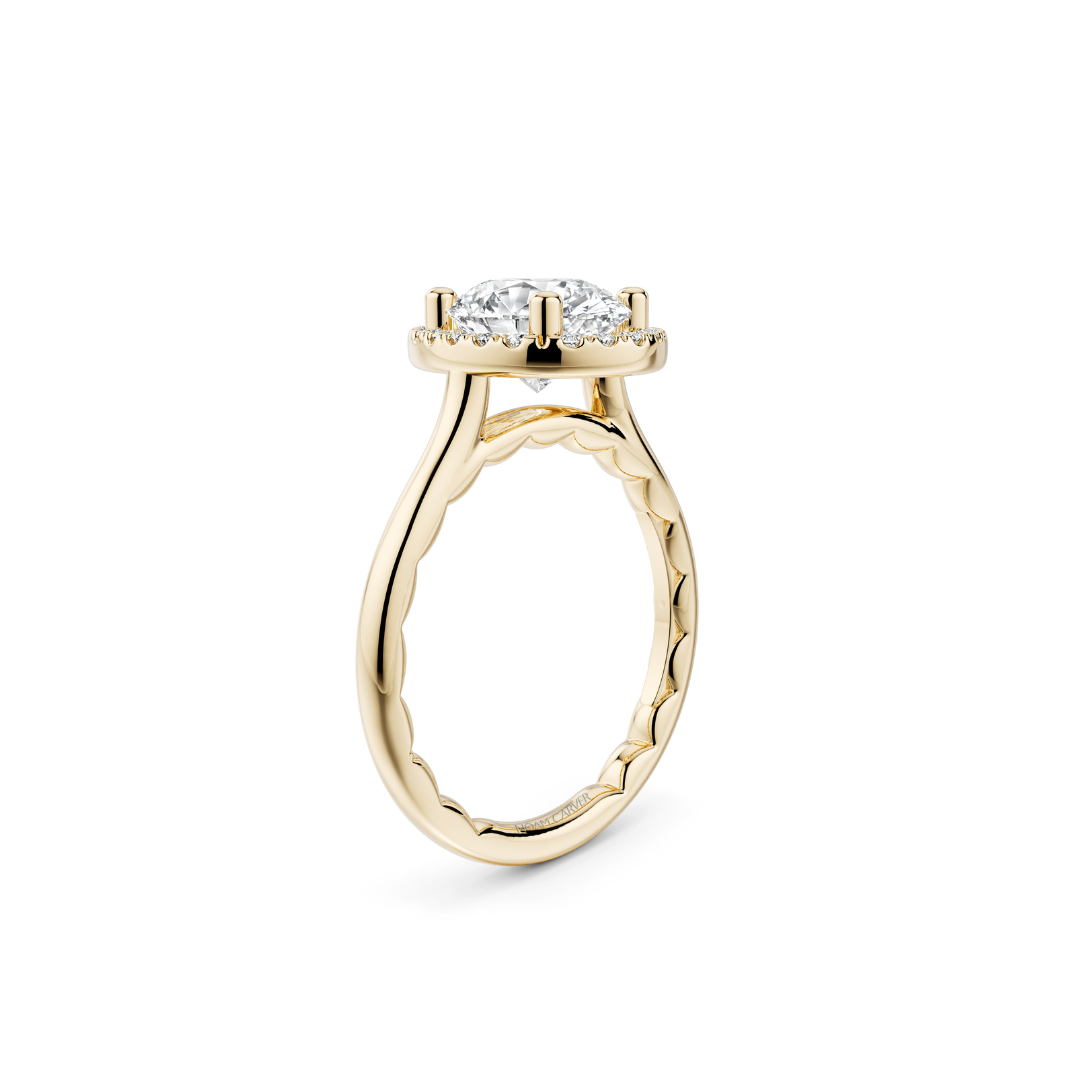 Crafted in warm yellow gold, this engagement ring features an oval center, encircled by a shimmering diamond halo. Elevated in a graceful cathedral style setting, the design is set on the Luna foundation, which includes crescent shaped cutouts within the band, allowing for natural finger size fluctuations and all day comfort. A perfect balance of timeless elegance and thoughtful innovation.