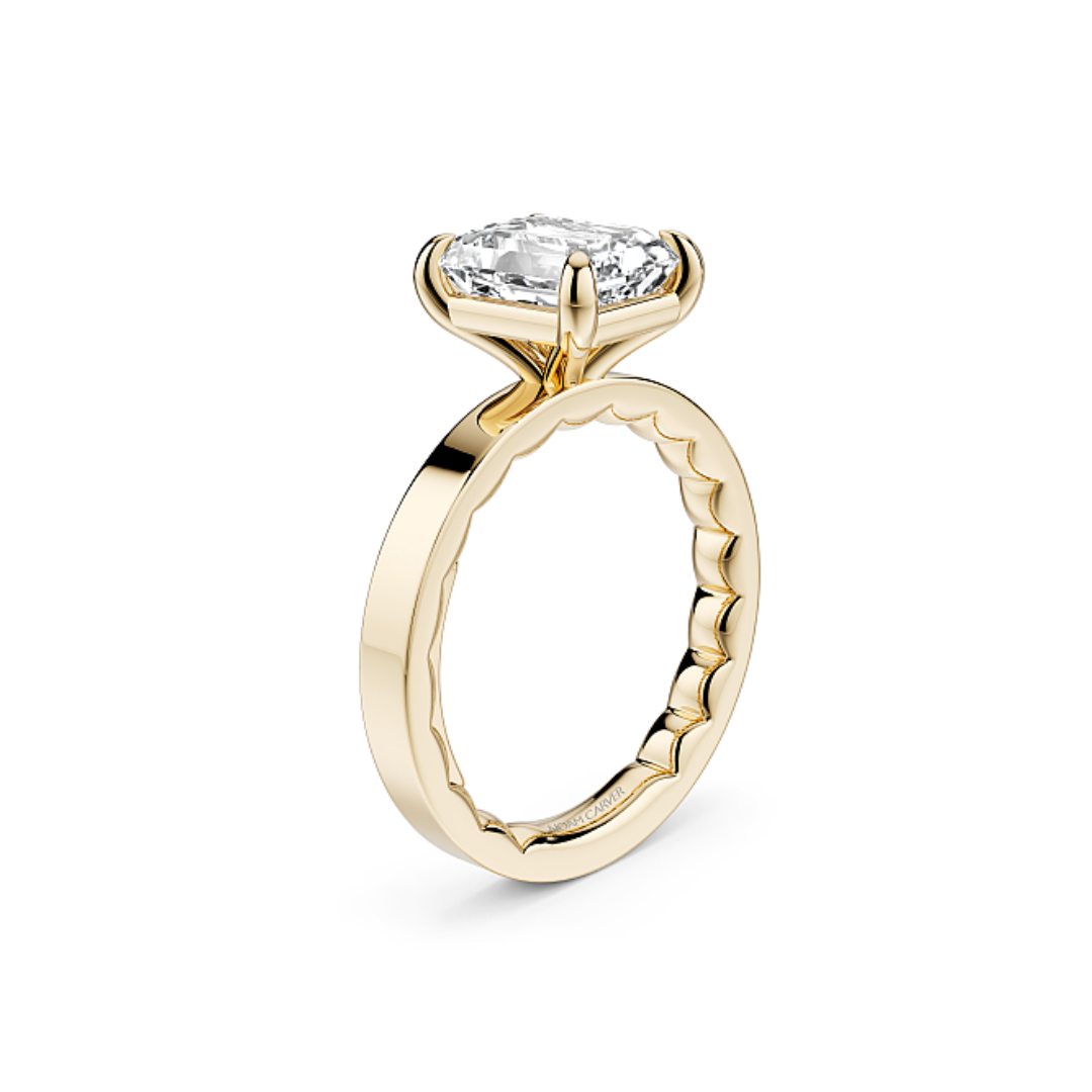 This yellow gold Luna Ring features a striking emerald cut stone, set on a luminous yellow gold cigar style band, blending classic elegance with contemporary style. Set on the Luna foundation, the crescent shapes within the band allow for finger size fluctuations up to one full size.