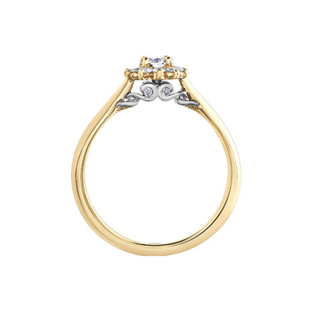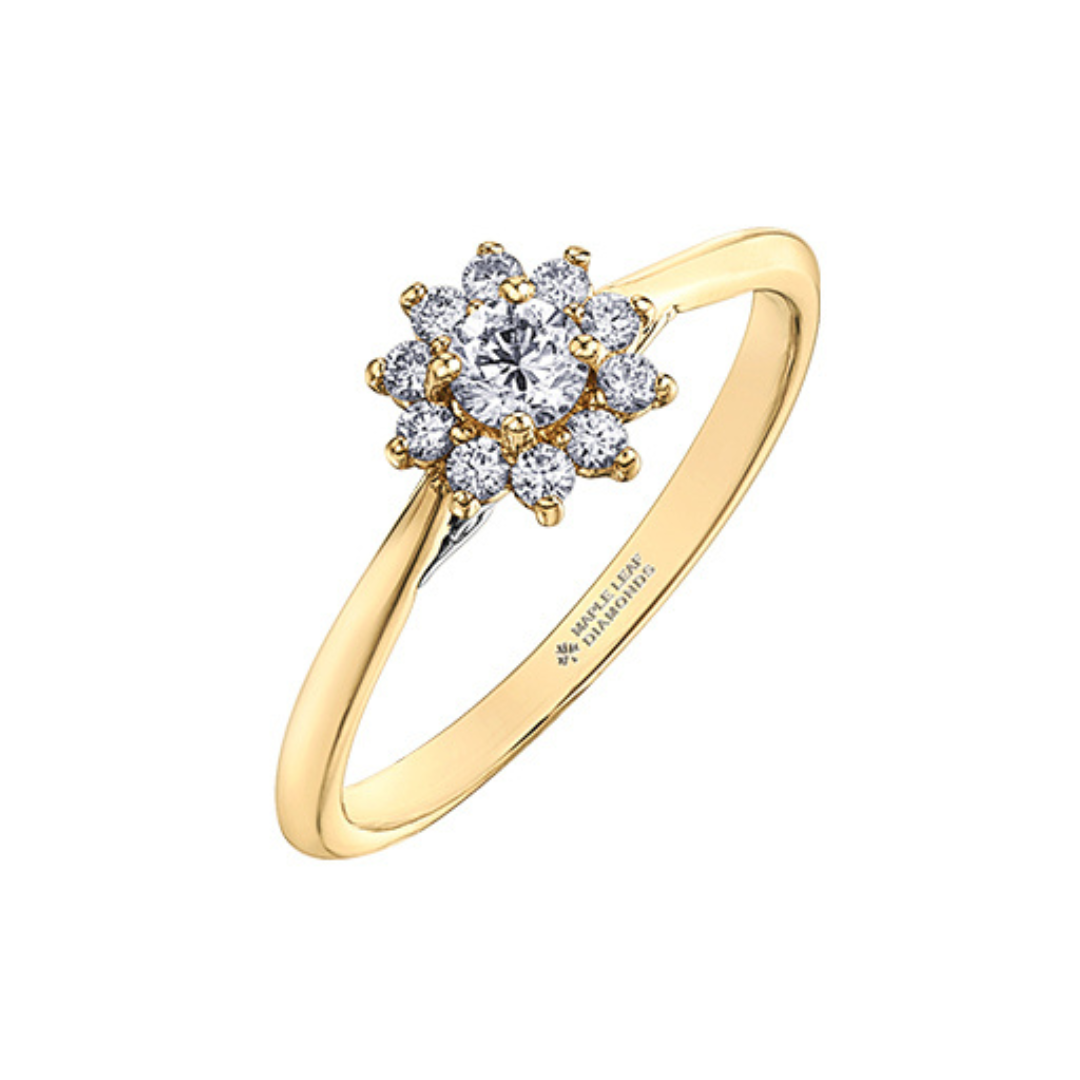 Crafted in luxurious white and yellow gold, this Maple Leaf diamond cluster ring showcases sparkling diamonds within the halo, surrounding a gorgeous round brilliant cut center. A captivating design that blends timeless elegance with modern sophistication.